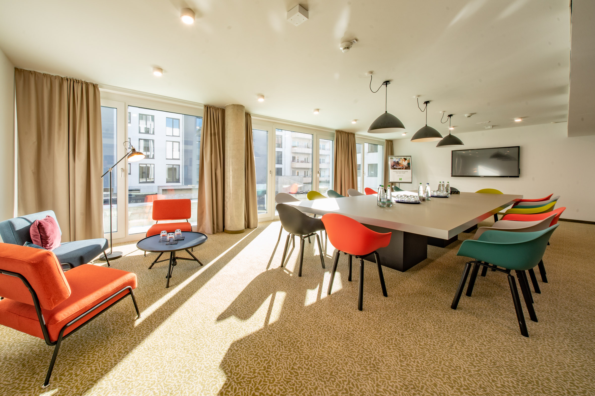 Die Querdenker Lounge befindet sich in der ersten Etage des Hotels und umfasst eine Kapazität von maximal 18 Personen. Sie verfügt über die neuesten Technikstandards wie Touchscreen TV 65 inches und Glasfaser Highspeed LAN bzw. WLAN