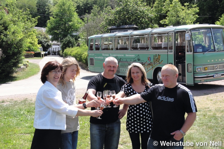 Abends fährt euch ein originaler Oldtimerbus zum Weingut von Nell. Dort erwartet euch eine Weinprobe mit verschiedenen Weinen aus der Region und im Anschluss ein schmackhaftes Winzermahl.